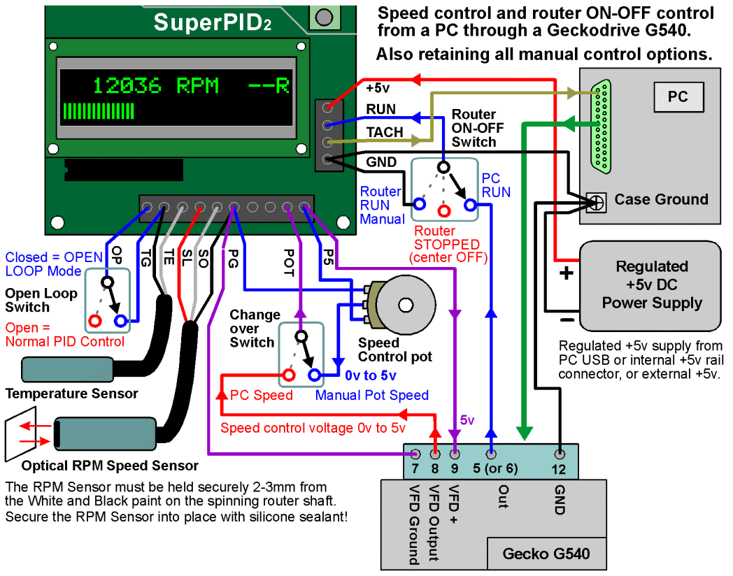 The wiring diagram below shows all possible connections from Super-PID to the Gecko G540. This enables