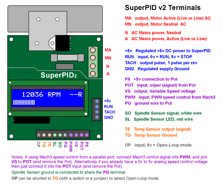 The wiring diagram below shows all possible connections from Super-PID to the Gecko G540. This enables